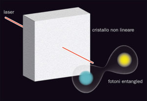 Cerchiamo dunque di capire un po’ più in dettaglio in che cosa consiste. Immaginiamo di avere una sorgente che emette due fotoni (le “particelle” quantistiche fondamentali di cui la luce è costituita). I fotoni sono caratterizzati dalla loro energia e, essendo quanti di luce, cioè pacchetti di onde elettromagnetiche, dal piano di vibrazione del campo elettrico, la cosiddetta “polarizzazione” (quella che viene selezionata dagli occhiali 3D dei cinema, permettendoci di vedere figure leggermente diverse dai due occhi e quindi un’immagine tridimensionale).