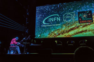 Umberto Petrin al pianoforte durante l’evento “Di arte e di scienza”, una conferenza spettacolo organizzata dall’Infn come evento conclusivo della prima edizione di “Art&Science across Italy” (Napoli, Teatro Diana, 6 aprile 2017).