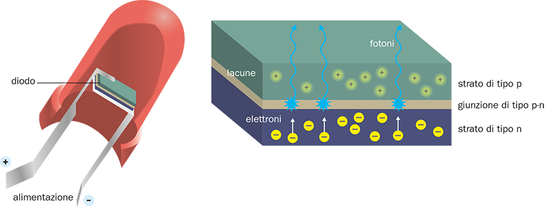Il nome LED è l’acronimo per light emitting diode, ovvero diodo a emissione di luce. Il LED è infatti un particolare tipo di diodo, cioè un dispositivo elettronico il cui funzionamento è basato sulle proprietà dei materiali semiconduttori. I sottili strati di materiale semiconduttore che costituiscono un LED vengono manipolati in modo da avere alle estremità due aree con densità di carica diversa, una negativa e l’altra positiva, fra le quali è presente una barriera di potenziale. Quando il LED è attraversato da corrente, le cariche negative e positive si muovono le une verso le altre e, se la tensione applicata ai capi del LED è sufficiente a far “oltrepassare” la barriera di potenziale, si ricombinano emettendo energia sotto forma di radiazione luminosa. Maggiore è l’energia rilasciata, minore sarà la lunghezza d’onda della radiazione, e di conseguenza del colore visibile. Il processo è molto efficiente dal punto di vista energetico: le lampadine a LED in commercio oggi consumano molto poco rispetto alla luce che emettono.
