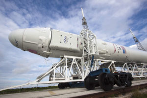 Il lanciatore Falcon 9 e la capsula Dragon di Space X durante il trasferimento sulla rampa di lancio di Cape Canaveral.