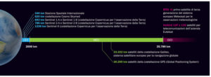 Tipi di orbite satellitari: orbite terrestri basse (LEO, Low Earth Orbits), al di sotto dei 2000 km di altitudine; orbite terrestri medie (MEO, Medium Earth Orbits), tra i 2000 km e i 35.786 km di altitudine; orbita geostazionaria (GEO, Geostationary Earth Orbit), a 35.786 km, in corrispondenza della quale il periodo di rivoluzione del satellite è uguale al periodo di rotazione della Terra.