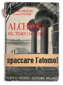 “Spaccare l’atomo!”: così annunciava la fascetta che avvolgeva il primo libro italiano dedicato a divulgare al grande pubblico la fisica nucleare. Correva l’anno 1936 e il volume s’intitolava “Alchimia del tempo nostro”. A realizzare l’opera erano state due giovanissime autrici, al loro debutto come scrittrici scientifiche: Ginestra Amaldi e Laura Fermi, mogli rispettivamente di Edoardo e di Enrico.