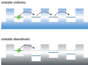 In un cristallo ordinato (in alto), i livelli di energia degli elettroni sono gli stessi in ogni buca di potenziale e gli elettroni possono facilmente attraversare le barriere, dando luogo alla conduzione elettrica. In un cristallo disordinato (in basso), ci sono disuniformità nei livelli di energia che inibiscono il moto degli elettroni e producono la localizzazione.