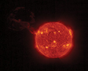 Una potente emissione solare, osservata dallo strumento Extreme Ultraviolet Imager a bordo del satellite Solar Orbiter. Si nota a sinistra il potentissimo getto di plasma solare, che si estende per 3,5 milioni di chilometri. Fenomeni come questo producono tempeste geomagnetiche sulla Terra, in grado di alterare il funzionamento dei sistemi di comunicazione satellitare e a Terra.