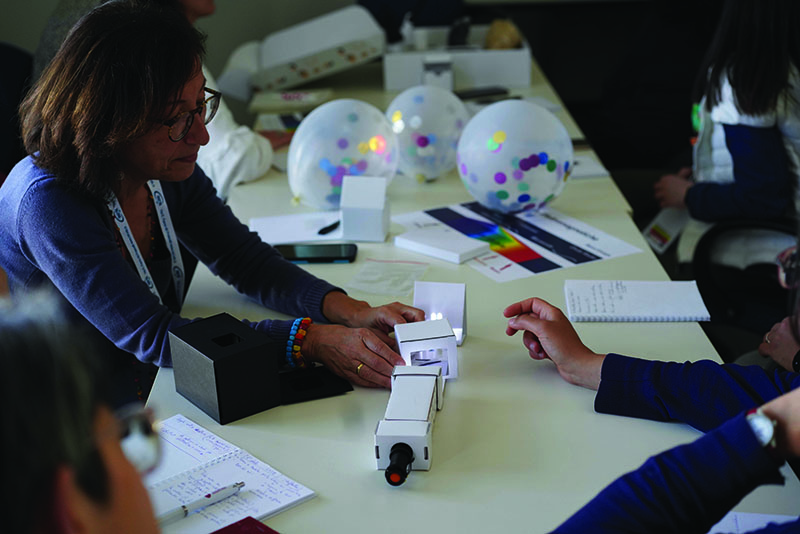 Il kit è una grande scatola modulare che contiene il materiale per condurre attività sperimentali su quattro tematiche: il metodo scientifico, la pressione, la luce e la carica elettrica. Permette di svolgere circa 20 esperienze, descritte in una guida pedagogica che suggerisce all’insegnante anche alcune modalità per condurre le attività in classe. La giornata di formazione è l’altro elemento essenziale del progetto: i docenti possono sperimentare in prima persona le attività e il metodo che potranno mettere in pratica con gli studenti e le studentesse grazie al kit. La chiave è stimolare la loro curiosità con un approccio attivo, coinvolgente e divertente. Inoltre, per i docenti è un’occasione per entrare in contatto con la ricerca portata avanti dal CERN e dall’INFN e scoprire come si lega alle scienze insegnate a scuola.