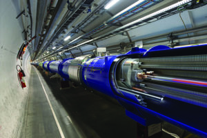Foto del tunnel di LHC in uno dei tratti curvi (i cosiddetti “archi”). In blu si vedono i magneti superconduttori dipolari. Lo spaccato mostra l’interno del magnete con le due linee da vuoto dove circolano i fasci di protoni (blu e rosso). Il vuoto è presente dove circolano i fasci e all’interno dei grandi tubi blu (criostati) per garantire l’isolamento termico.