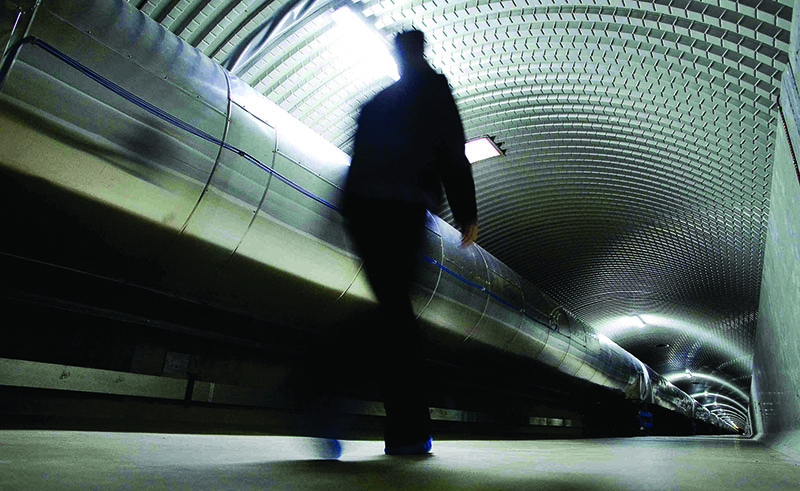 Foto del tunnel dell’esperimento Virgo a Cascina, nei pressi di Pisa. La camera da vuoto ha un diametro di 1,2 m ed è rivestita di isolante termico utilizzato durante il bakeout, per diminuire la dispersione termica e, durante il funzionamento, per limitare le escursioni termiche.