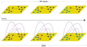 La figura schematizza la differenza tra la diffusione di un virus (indicato dal pallino azzurro) nel XIV secolo (sopra) e nel 2022 (sotto). I nodi descrivono le città, i link indicano le loro connessioni. Nel 2022 ci sono le connessioni a più lungo raggio tipiche della rete di trasporto moderna (in rosso). L’effetto è una dinamica di diffusione molto più veloce.