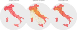 Esempio di schematizzazione di un modello epidemiologico. Alla struttura geografica, caratterizzata dalla distribuzione della popolazione, è possibile aggiungere le dinamiche degli spostamenti a lungo raggio (per via aerea) e di quelli a più corto raggio (via terra) tipici delle varie zone, permettendo così di descrivere e modellizzare la diffusione di una epidemia.