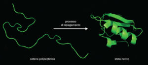 Le proteine sono catene polipeptidiche composte da 20 diversi tipi di aminoacidi. In generale, se la sequenza di aminoacidi è scelta in modo casuale, queste catene non assumono una forma precisa, ma cambiano struttura di continuo. Al contrario, le specifiche sequenze di aminoacidi che si trovano nelle proteine selezionate dall’evoluzione generano un comportamento completamente diverso: quasi tutte le proteine, infatti, assumono un’unica conformazione, in cui svolgono la loro azione biologica. Queste speciali catene sono in grado di ripiegarsi su se stesse spontaneamente, visitando stati via via più favorevoli energeticamente, fino a raggiungere la conformazione di minima energia, chiamata “stato nativo” (vd. fig. a).