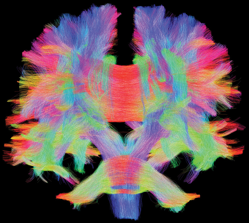 Immagine trattografica ottenuta in risonanza magnetica con una tecnica di acquisizione pesata in diffusione, acquisita ed elaborata presso l’IRCCS Fondazione Stella Maris (Pisa). Viene sfruttato il movimento delle molecole d’acqua nell’ambiente anisotropo costituito dalla materia bianca cerebrale per ricostruire le fibre assonali che la compongono. È l’unica tecnica di imaging che permette di visualizzare le fibre assonali in vivo. In rosso sono rappresentate le fibre che hanno direzione trasversale (sinistra-destra), in verde quelle che vanno in direzione anteroposteriore (ortogonale al foglio), mentre in blu quelle che vanno in direzione verticale (alto-basso).