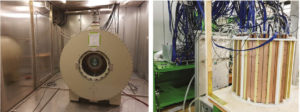 A sinistra, il magnete principale di TRIMAGE, un sistema trimodale che combina PET, RMN ed elettroencefalografia per lo studio del cervello. A destra, il modulo PET assemblato e cablato.