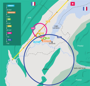 Schema delle macchine acceleratrici presenti e pianificate per il prossimo futuro al Cern di Ginevra. Il complesso di acceleratori del Large Hadron Collider (Lhc) porta i protoni all’energia massima di 7 TeV per fascio tramite una catena costituita da un acceleratore lineare (Linac4, fino a 160 MeV), da due anelli più piccoli, Proton Synchrotron Booster (fino a 2 GeV) e Proton Syncrotron (Ps, che accelera da 2 a 26 GeV), seguiti dal più grande Super Proton Syncrotron (Sps), in grado di iniettare un fascio da 450 GeV per l’accelerazione finale in Lhc. I possibili acceleratori per il futuro sono molto diversi tra loro: il Future Circular Collider (Fcc) sarebbe un ulteriore anello, lungo 100 km (rispetto ai 27 di Lhc), che riceve il fascio dalla catena di macchine esistenti per portarlo a qualche decina di TeV, mentre il Compact Linear Collider (Clic) sarebbe costituito da due macchine lineari, di lunghezza tra gli 11 e 50 km, a seconda dei tre possibili stadi di accelerazione a 380 GeV, 1,5 TeV e fino a 3 TeV.