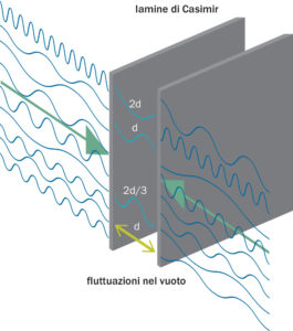 Questa energia, che sembrerebbe solo una fantasiosa invenzione di qualche fisico teorico, in realtà trova riscontro in un effetto fisico macroscopico ben noto che è l’“effetto Casimir”: consideriamo due lamine metalliche non elettricamente cariche e molto vicine tra loro immerse in uno spazio vuoto (nel senso quantistico del termine). A causa della riflettività delle superfici, solo alcuni fotoni di vuoto “possono sopravvivere” nello spazio interno alle lamine. Per capire meglio questo punto, pensiamo a una corda di chitarra che è bloccata ai due estremi: il ponte da un lato e il dito dall’altro. Queste posizioni determinano il modo in cui la corda può vibrare e di conseguenza la nota che viene prodotta. Per produrre una nota diversa è necessario cambiare la posizione della mano sulla tastiera.