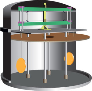 Schema della bilancia dell’esperimento Archimedes. Agli estremi del braccio della bilancia (uno dei due parallelepipedi verdi) sono sospesi due campioni (i due dischi arancioni). Ogni campione è costituito da una serie di cavità di Casimir in successione e in una delle due viene periodicamente variata la quantità di energia di punto zero sfruttando l’effetto Casimir. L’intero esperimento è contenuto in una camera da vuoto che sarà, a sua volta, inserita in un grande criostato.