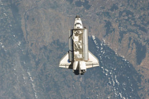 Lo shuttle Endeavour in procinto di effettuare, nel maggio del 2011, l’attracco e la consegna di AMS-02, visibile all’interno della stiva di carico del velivolo, a bordo della Stazione Spaziale Internazionale nel corso della missione STS-134.