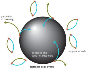 Illustrazione schematica di come funziona il meccanismo della produzione della radiazione di Hawking. Vicino all’orizzonte degli eventi di un buco nero, la distorsione dello spaziotempo induce le coppie di particella-antiparticella virtuali a diventare reali, spendendo energia a scapito dell’energia gravitazionale del buco nero. Una delle due particelle cade poi dentro il buco nero, mentre l’altra si allontana. Un osservatore a grande distanza dal buco nero vede quindi radiazione emessa dal buco nero. Il processo porta quindi alla lenta evaporazione del buco nero stesso.