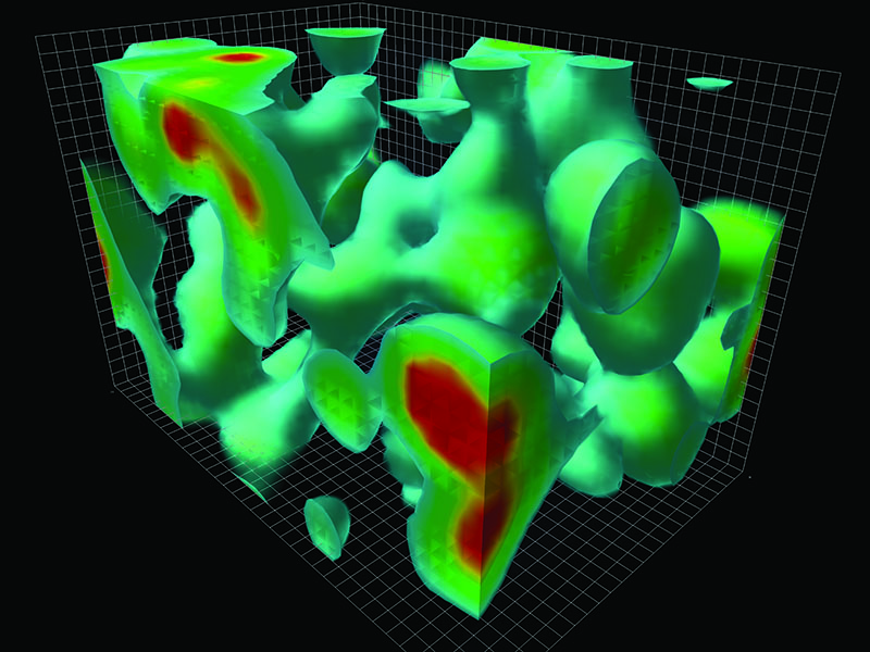 Simulazione delle fluttuazioni del vuoto nella teoria della cromodinamica quantistica, responsabile delle interazioni forti. La figura mostra una porzione di spazio dal volume di 2,4 x 2,4 x 3,6 fm3, sufficiente a contenere un paio di protoni. Le zone colorate rappresentano bolle di varia densità di energia del vuoto.