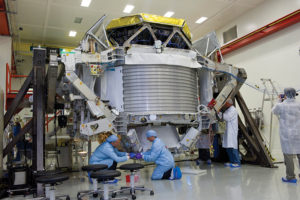 L’apparato AMS-02, nella Clean Room, al CERN, in cui è stato assemblato. Nella foto solo una parte del MultiLayer Insulator (MLI, il tipico materiale bianco che riflette la radiazione solare con cui vengono rivestite le apparecchiature nello spazio) è installata, lasciando “nude” le strutture e i rivelatori sottostanti.