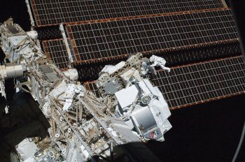L’apparato AMS-02, installato sulla trave principale (main truss) della ISS. Sullo sfondo è possibile vedere i grandi pannelli solari che forniscono elettricità a tutta la strumentazione della ISS, tra cui i circa 2,5 kW di potenza necessari per il funzionamento di AMS-02.