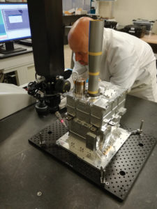 Test metrologico di una delle unità di volo a bordo di IXPE, nelle camere pulite della sezione di Pisa dell’Istituto Nazionale di Fisica Nucleare. L’involucro metallico contiene il Gas Pixel Detector e l’elettronica di lettura associata. A bordo di IXPE ci sono tre unità identiche, al fuoco di altrettante ottiche a raggi X.