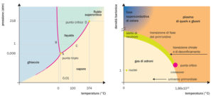 A sinistra, diagramma di fase dell’acqua nel piano temperatura (in gradi Celsius) e pressione (in atmosfere). Alla pressione di una atmosfera, l’acqua è nella sua forma liquida fra 0 gradi (punto B) e 100 gradi (punto C). Alla temperatura di 374 gradi e alla pressione di 218 atmosfere (punto critico D) la transizione fra liquido e vapore avviene in modo continuo, senza calore latente. Nel punto A le tre fasi (solido, liquido e vapore) co-esistono. Le linee rosse denotano le transizioni di fase del prim’ordine. A destra, diagramma di fase della materia fortemente interagente (materia adronica) nel piano temperatura (in gradi Celsius) e densità barionica (in unità della densità nucleare, pari a circa 2,7 x 1014 g/cm3).