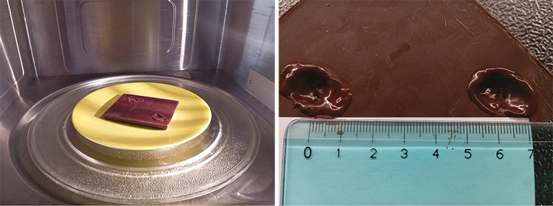 Una misura di c concettualmente uguale a quanto descritto si può ottenere mettendo per pochi secondi una tavoletta di cioccolata nel forno a microonde (vd. foto a sinistra), che ha una frequenza fissa di 2,45 GHz, e avendo avuto cura di bloccare la rotazione del piatto. I due punti in cui la tavoletta si scioglie distano mezza lunghezza d’onda (ca. 6 cm, vd. foto a destra). Moltiplicando questa distanza (misurata ad esempio in cm) per due e per 2,45 GHz, si ottiene il valore di c in cm/s. Un raro caso in cui, terminato l’esperimento, si può mangiare l’apparato sperimentale!
