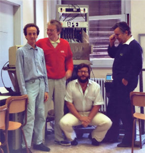 1986, il primo Ape (denominato simpaticamente “Apetto”), con (da sinistra) Enzo Marinari, Pier Stanislao Paolucci, Nicola Cabibbo, (della sezione Infn di Roma Sapienza), in piedi, e Gaetano Salina (della sezione Infn di Tor Vergata), seduto.