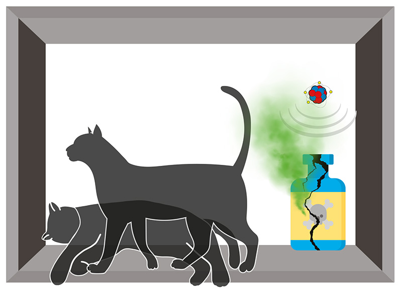 Per far capire ai suoi colleghi quanto fosse strana la meccanica quantistica applicata a un sistema macroscopico, Erwin Schrödinger inventò in un articolo del 1935 il famoso esperimento mentale che ha come protagonista un gatto chiuso in una scatola assieme a una sostanza radioattiva, che rappresenta il sistema quantistico. La sostanza radioattiva si trova in una sovrapposizione di stati, con una probabilità del 50% che emetta (o non emetta) radiazione dopo un tempo di (diciamo) 10 minuti. Se la radiazione viene emessa si aziona un meccanismo che rompe una fiala contenente del veleno, con conseguente morte dello sfortunato gatto. Ma, poiché lo stato è determinato dalla misura, trascorsi i 10 minuti, prima di aprire la scatola, lo stato non è ancora determinato (l’apertura della scatola corrisponde alla misura). E quindi, in quel momento, coerentemente con il fatto che la sostanza si trova in una sovrapposizione di stati, la risposta alla domanda: “che fine ha fatto il gatto?” è che il gatto è sia vivo che morto. Il gatto di Schrödinger è diventato il paradigma del problema della misura e dopo tutti questi anni la comunità scientifica sta ancora discutendo su quale potrebbe essere la soluzione del paradosso. Non che non ci siano proposte: anzi, ce ne sono sin troppe! Alcune di esse assumono che in natura esistano soltanto particelle che avrebbero delle traiettorie determinate da condizioni aggiuntive (nel passato si parlava di onde che guidavano le particelle): si tratta dell’interpretazione di de Broglie-Bohm. C’è poi l’affascinante interpretazione dei “molti mondi”, dovuta a Hugh Everett III: ogni volta che viene eseguita una misura il mondo si divide, e ogni mondo realizza una delle possibilità. In questa interpretazione c’è dunque un mondo in cui il gatto è vivo e un altro in cui il gatto è morto. Queste due tipologie di interpretazioni, benché affascinanti, offrono – almeno per ora – poco appiglio ai fisici sperimentali: non c’è modo di confermare una delle due, in quanto le previsioni sperimentali sono identiche, in linea di massima, a quelle della meccanica quantistica standard. C’è però un’altra soluzione: una modifica radicale della meccanica quantistica, attraverso quelli che vengono definiti i “modelli di collasso dinamico”.