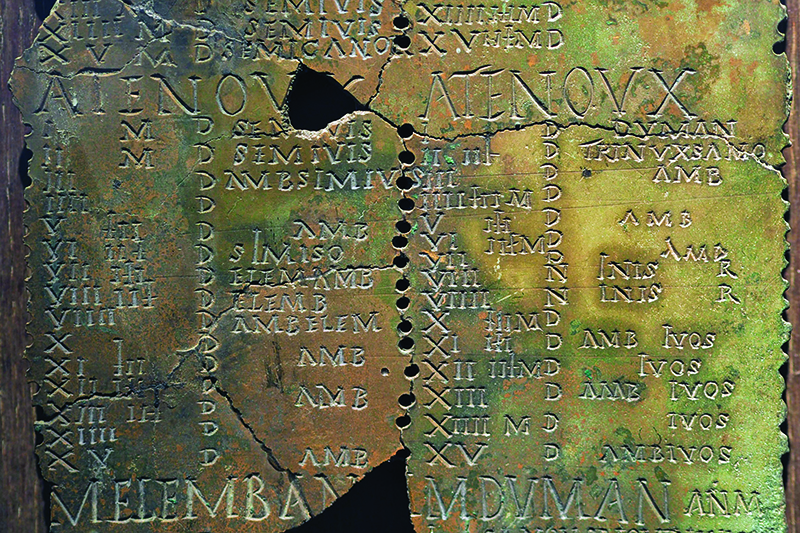 Il “calendario di Coligny”, tavola bronzea del II secolo d.C. Tra i più rilevanti documenti dell’epigrafia celtica, la lastra riporta, in caratteri latini, un calendario lunisolare di 62 mesi, riferibili a un arco temporale di 5 anni.