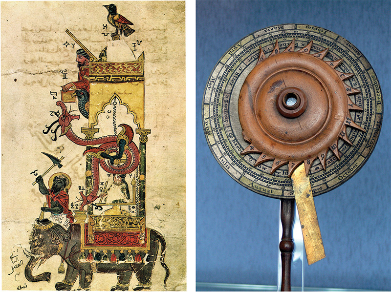 A sinistra, raffigurazione dell’“orologio elefante” dall’opera Compendio di al-Jazarī (XII-XIII secolo). A destra, un notturlabio tedesco del XVIII secolo.