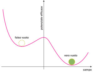 Esempio di curva del potenziale efficace in funzione del valore del campo. Il potenziale nel caso del “falso vuoto” è più elevato rispetto a quello del “vero vuoto”. C’è una specie di barriera tra i due stati. La temperatura, favorendo le fluttuazioni, può aiutare il superamento della barriera e il passaggio verso il “vero vuoto”.