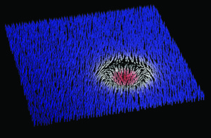 Rappresentazione della prima prova sperimentale di osservazione del decadimento del falso vuoto, ottenuta al Pitaevskii Center for Bose-Einstein Condensation di Trento. Inizialmente gli atomi si trovano in una configurazione in cui sono tutti allineati verso l’alto (il “falso vuoto”). Il decadimento del falso vuoto avviene quando in una porzione limitata di spazio cambia l’orientamento di parecchi atomi e si formano piccole bolle localizzate (le frecce rosse nell’immagine).