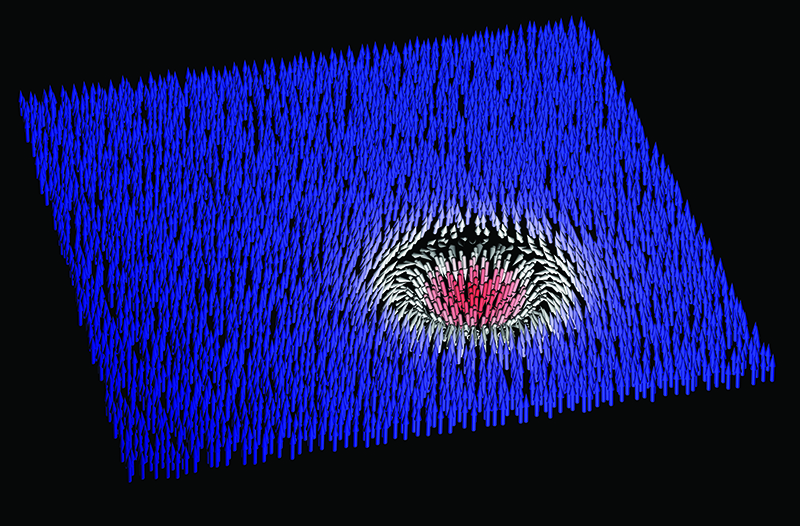 Rappresentazione della prima prova sperimentale di osservazione del decadimento del falso vuoto, ottenuta al Pitaevskii Center for Bose-Einstein Condensation di Trento. Inizialmente gli atomi si trovano in una configurazione in cui sono tutti allineati verso l’alto (il “falso vuoto”). Il decadimento del falso vuoto avviene quando in una porzione limitata di spazio cambia l’orientamento di parecchi atomi e si formano piccole bolle localizzate (le frecce rosse nell’immagine).