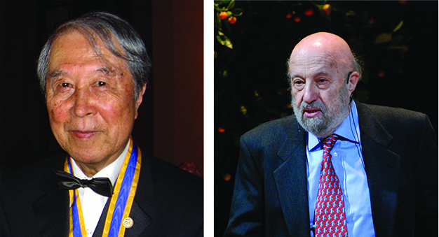 A sinistra Yoichiru Nambu, a destra Giovanni Jona-Lasinio, i fisici che hanno sviluppato il modello sulla rottura spontanea di simmetria per formazione di condensati, che porta il loro nome.